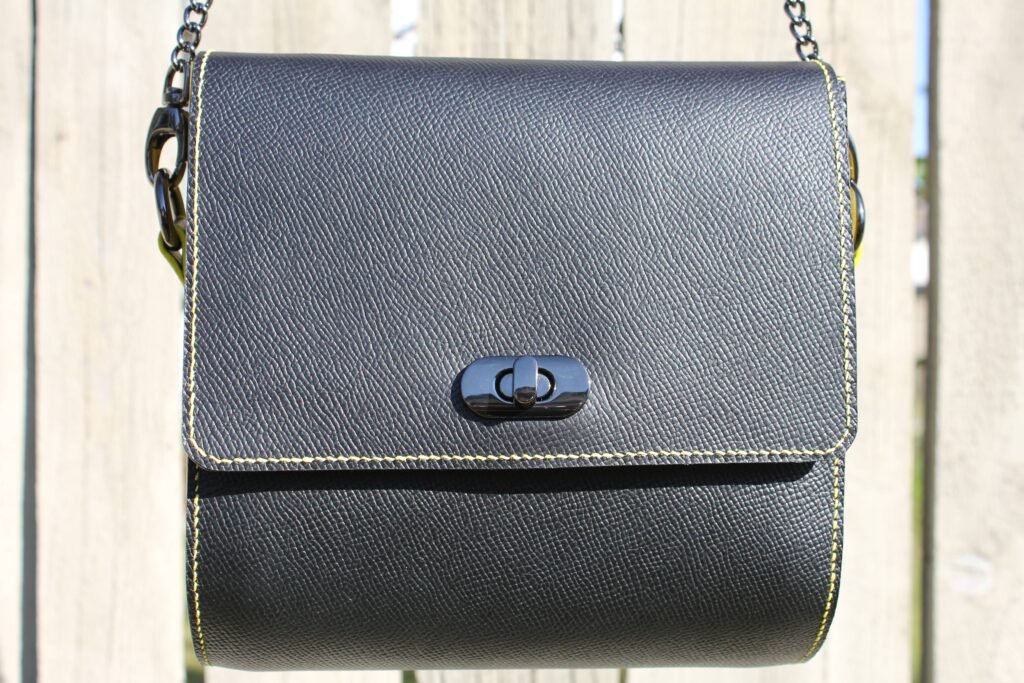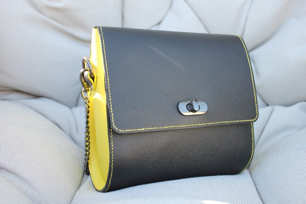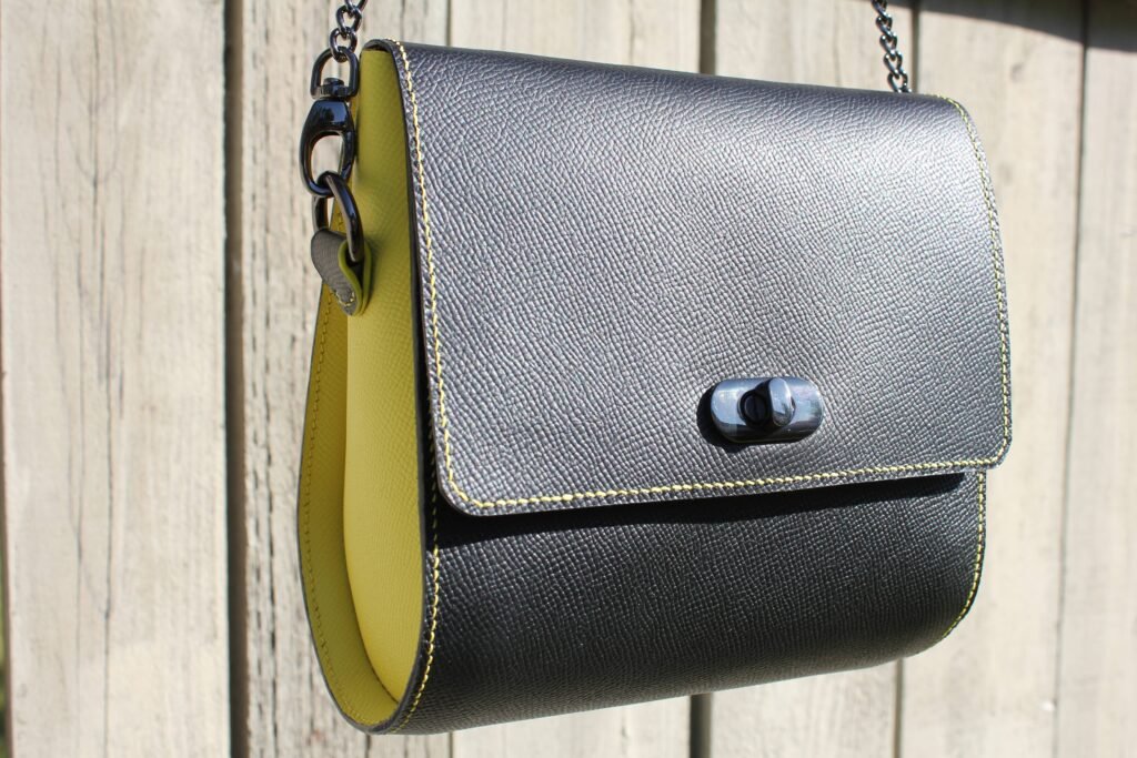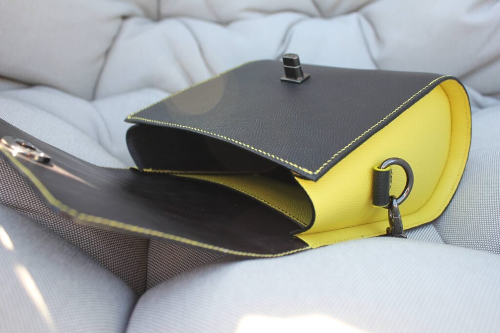 Poignant and eye catching, a flashy two-tone palette turns the subdued Chestnut Purse into something front and forward. Embellished with gunmetal hardware, a subtle shine highlights the front and sides of the purse, while being trimmed with brilliant yellow contrast stitching. Epsom leather is used in both black and yellow motifs, and is strongly resistant to damage. The calfskin lining has been dyed, cured, and treated with oils to soften and protect it for the life of the purse.
